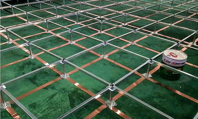 在防静电工程中,在防静电架空地板支架下铺设防静电泄流网,一般采用0.1*40mm铜箔600*600或1200*1200井字形铺设,然后用软铜线连接到接地端子上,100平米应不少于2个接地点。接地点防静电接地电阻不大于4欧姆,综合接地不大于1欧姆。